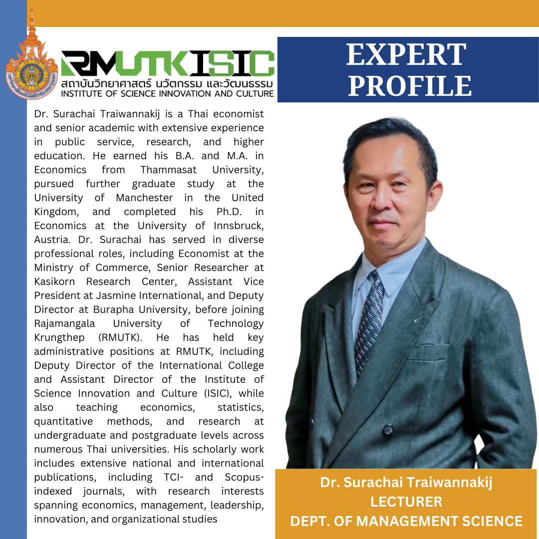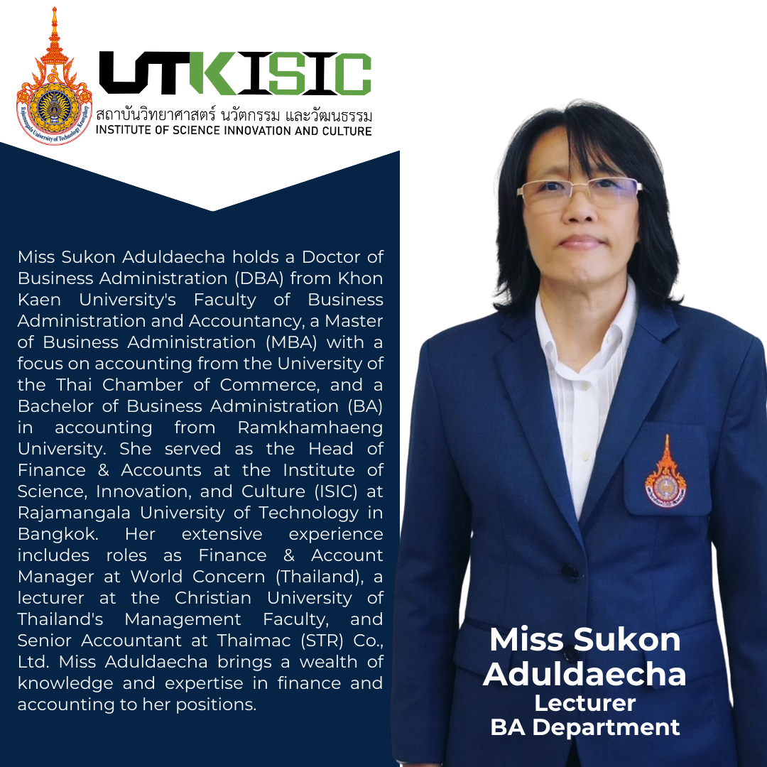 The Institute of Science, Innovation, and Culture is the newest center of higher education learning in Rajamangala University of Technology Krungthep. Established to provide research-oriented international programs in the fields of humanities, education and management, ISIC is poised to become the provider of high calibre program of instruction ensuring a seamless interplay of theory, practice and real world experiences of the learners. The Institute employs lecturers from all over the world, bringing with them their individual wealth of experience and culture which guarantees that ISIC students will develop a more global perspective on things and issues. The pool of lecturers is complemented with the Institute’s friendly staff who are ready to help students with their academic concerns.